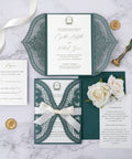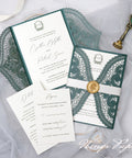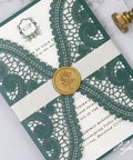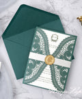 NingsPaper Emerald Green Laser Cut Invitation Cards with Ivory Belly Band and Wax Seal