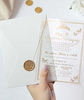 ★★ 1mm/0.04'' Foil Print in Gold Clear Acrylic Quinceanera Invitation Cards and Ivory Envelopes