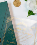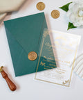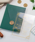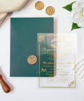 ★★ 1mm/0.04'' Foil Print in Gold Clear Acrylic  Quinceanera Invitation Cards  and Emerald Green Envelopes